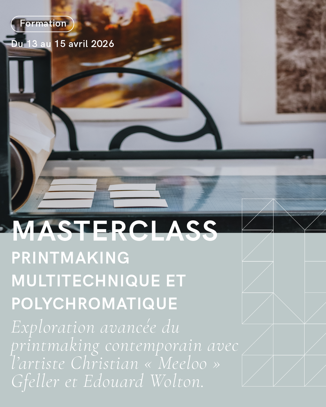 Cette masterclass expérimentale propose une exploration avancée du printmaking contemporain avec les artistes Christian Gfeller (duo Gfeller & Hellsgaard, fondateur de Beuys on Sale et Bongoût Éditions) et Edouard Wolton (chef de l’atelier Printmaking de la Fondation Fiminco et cofondateur de PRINTJAM).